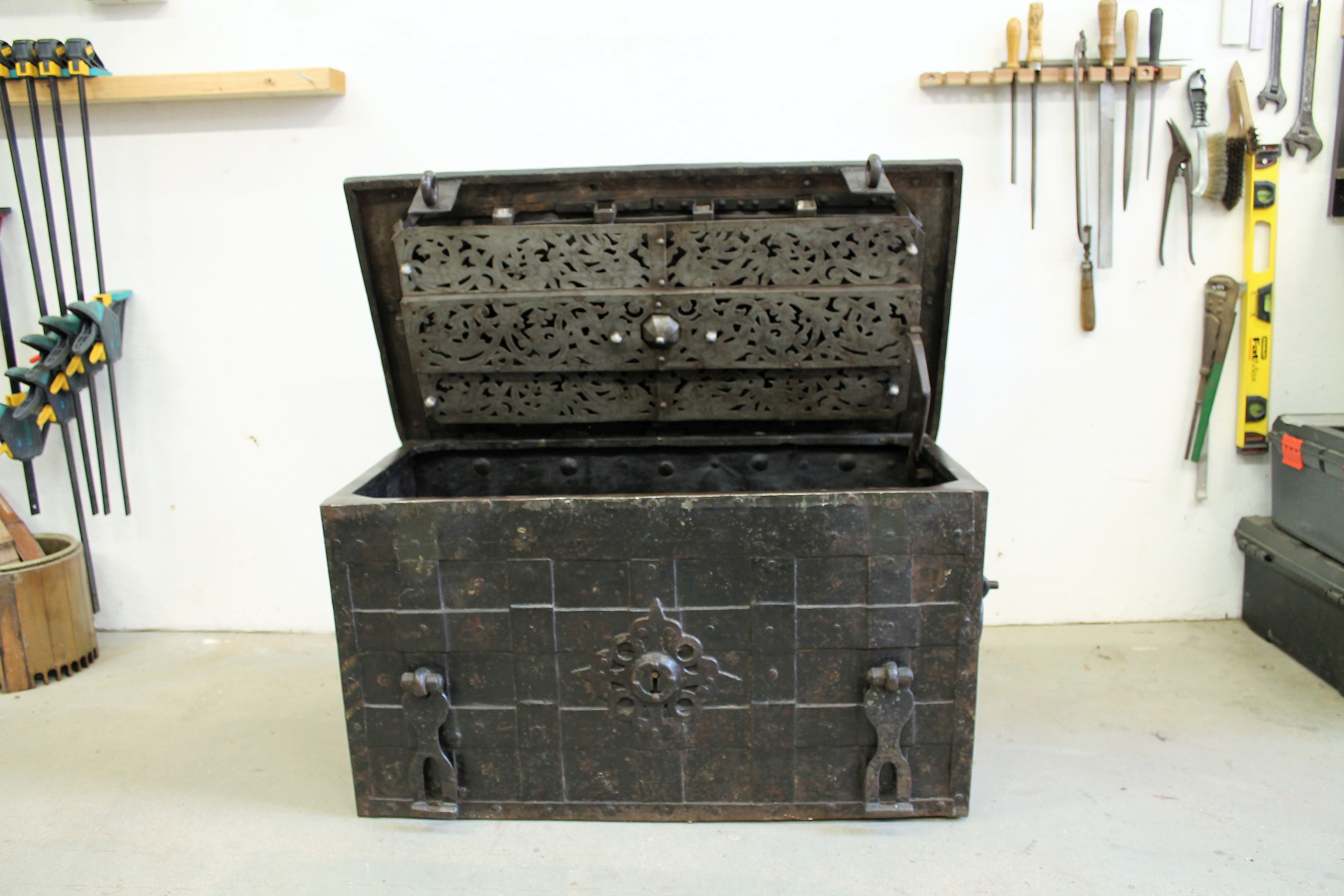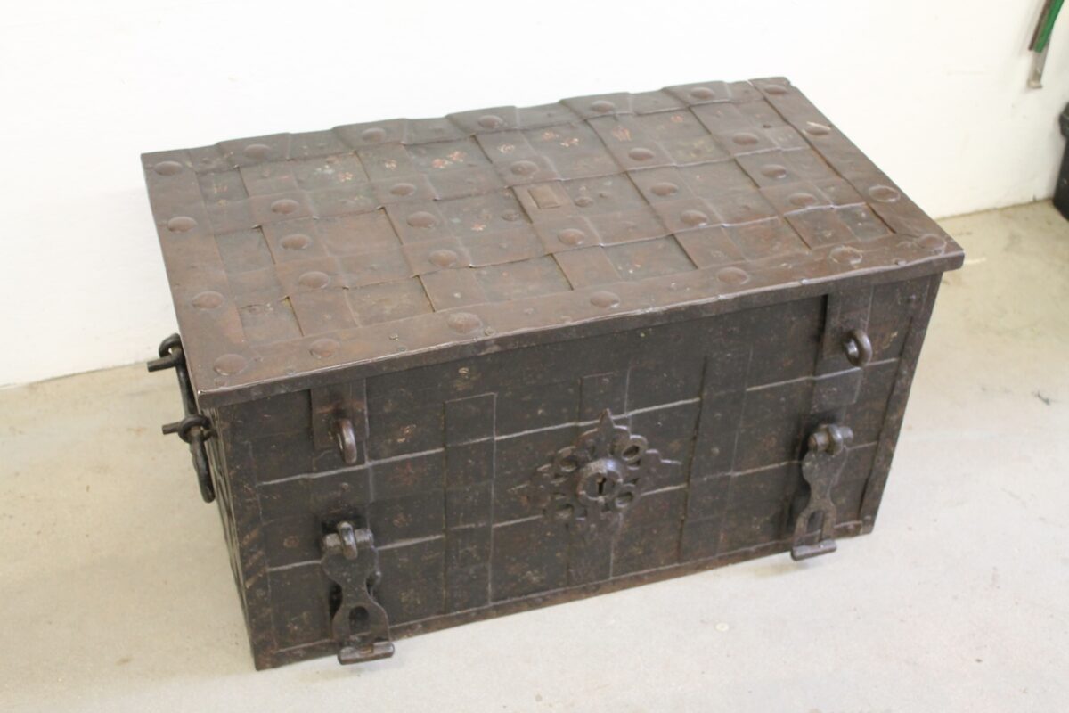 Duitse geldkist (Neurenberg) met verborgen slotgat, 17e eeuw. Er was geprobeerd met een breekijzer in te breken (niet gelukt), de klep was hierdoor krom en ontzet, dit is hersteld. Het mechanisme om het verborgen slotgat te openen was verdwenen en is teruggeplaatst. Het slot liep erg zwaar, dit is schoongemaakt en gesmeerd. Ook de siermoeren waarmee de versierde slotplaat vastzit zijn weer compleet gemaakt.