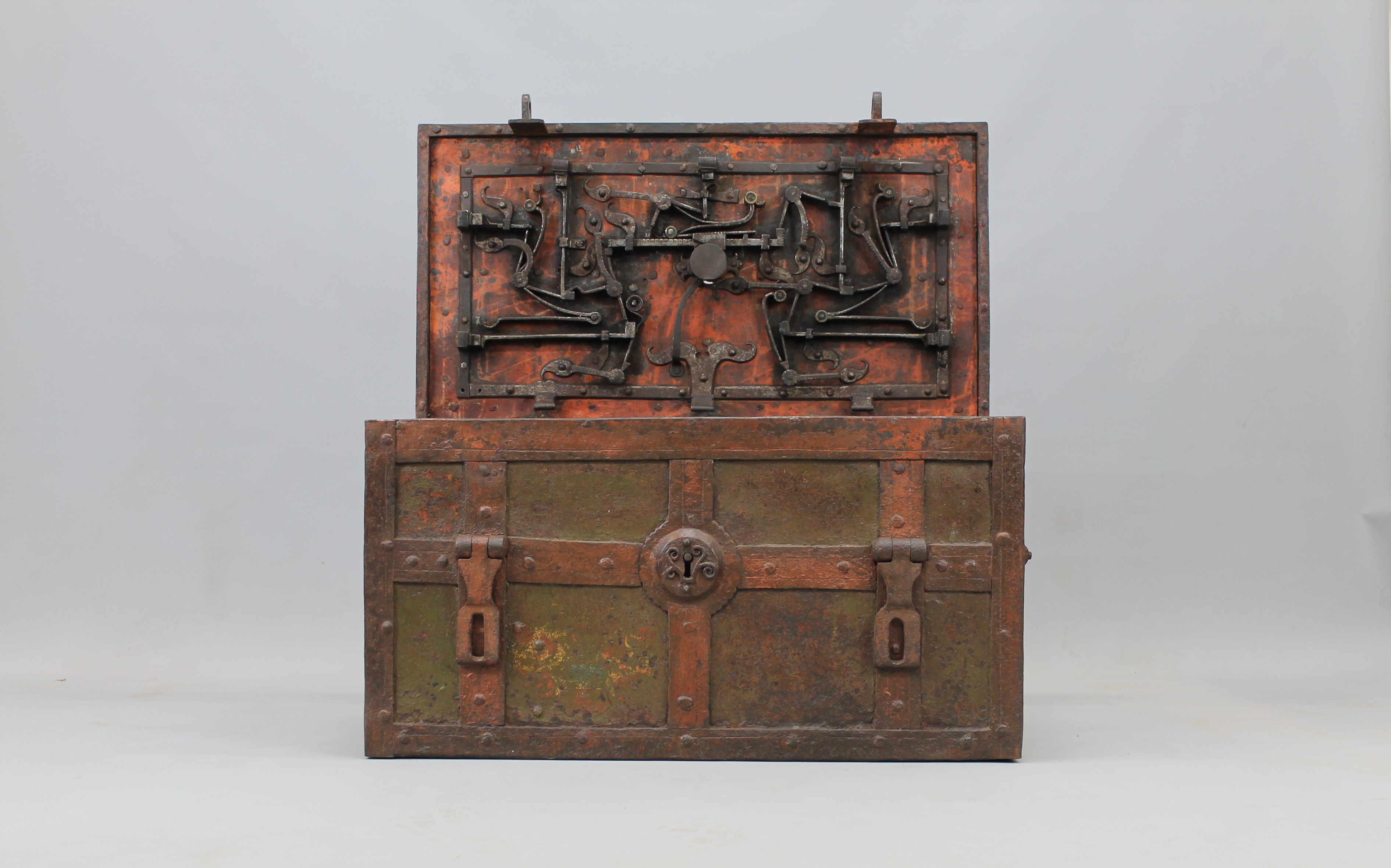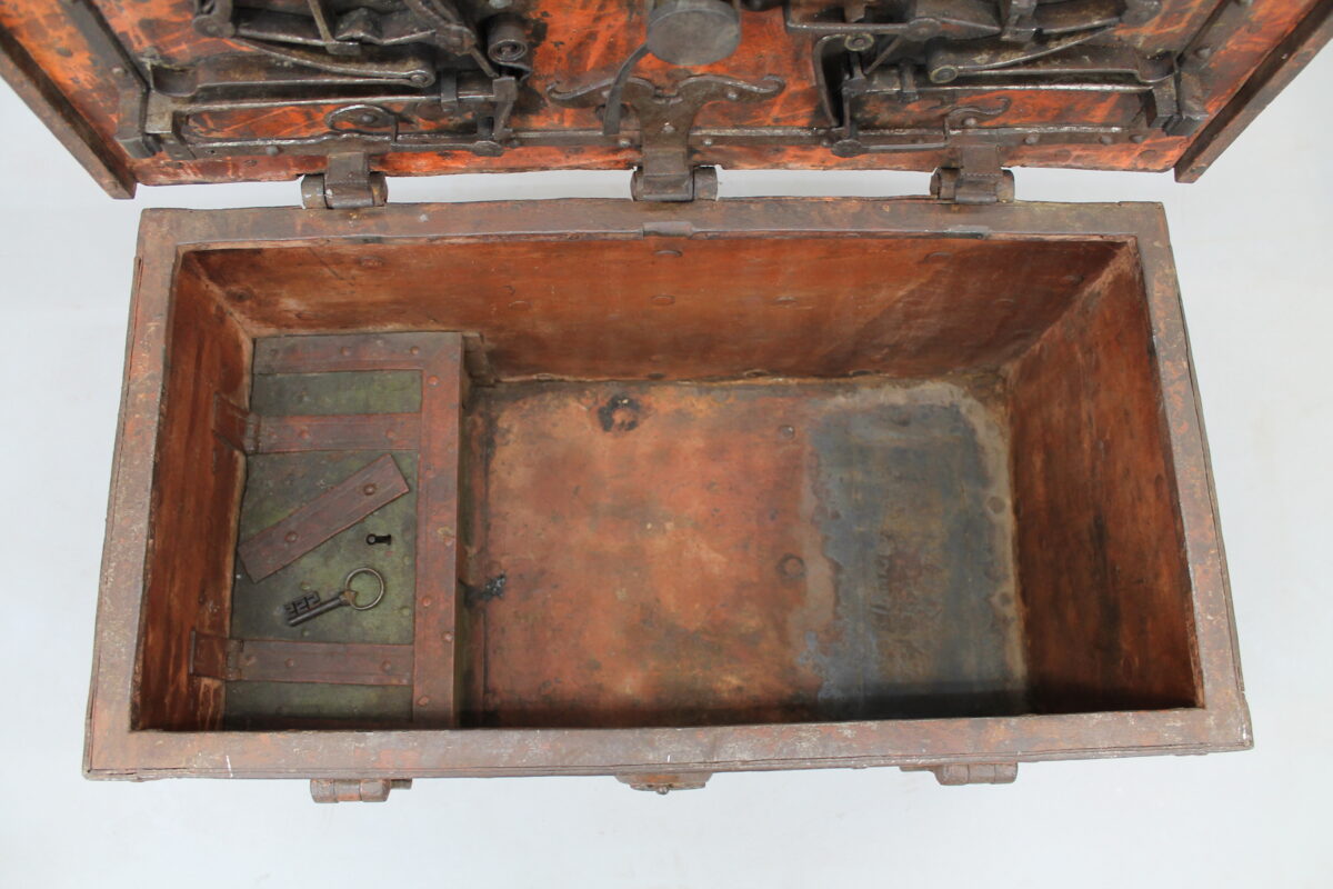 17e eeuwse Duitse geldkist. Het slot werkt goed, beide originele sleutels zijn nog aanwezig. br. 82,5 x h. 42 x d. 44 cm. Dit soort kisten zijn nog steeds goed als kluis te gebruiken.